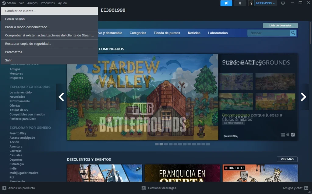En el menú de steam, arriba a la izquierda, elegir “Cambiar de cuenta”.
