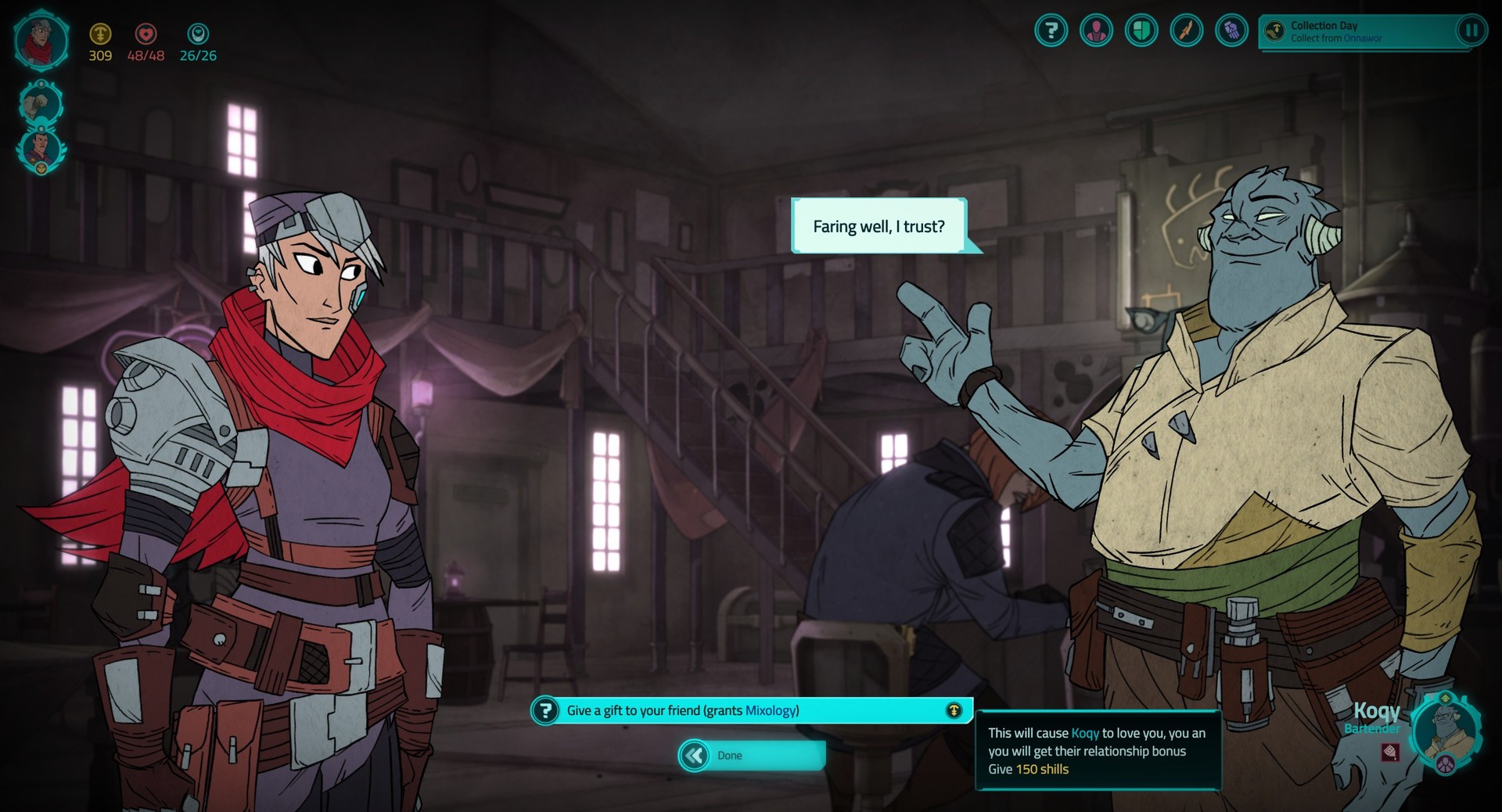 Each character has a factional allegiance and an opinion of you. Play politics between rivals, and try to capture the most powerful social boons. But watch out — doublecross the wrong person, and you’ll be subject to their bane!